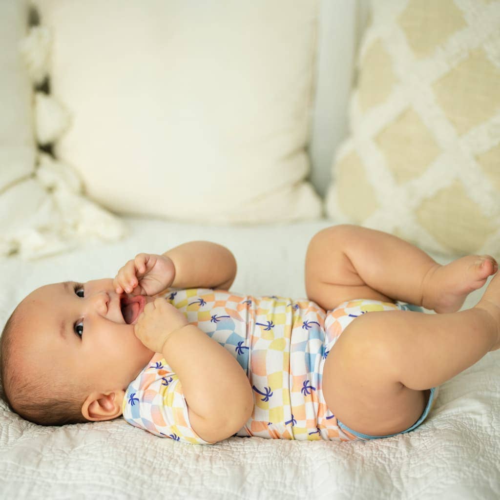 In this playful twist on a classic. Sunset Checker brings the energy with wavy, sun-washed squares and scattered palms that feel like summer in motion. Designed for keiki who never stop moving, this print is full of color, personality, and all the cozy comfort you love from Coco Moon.